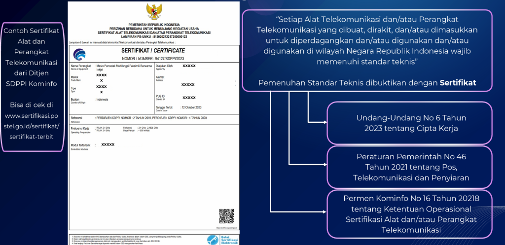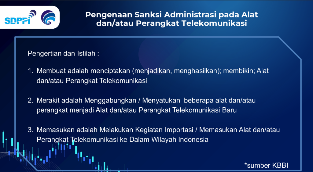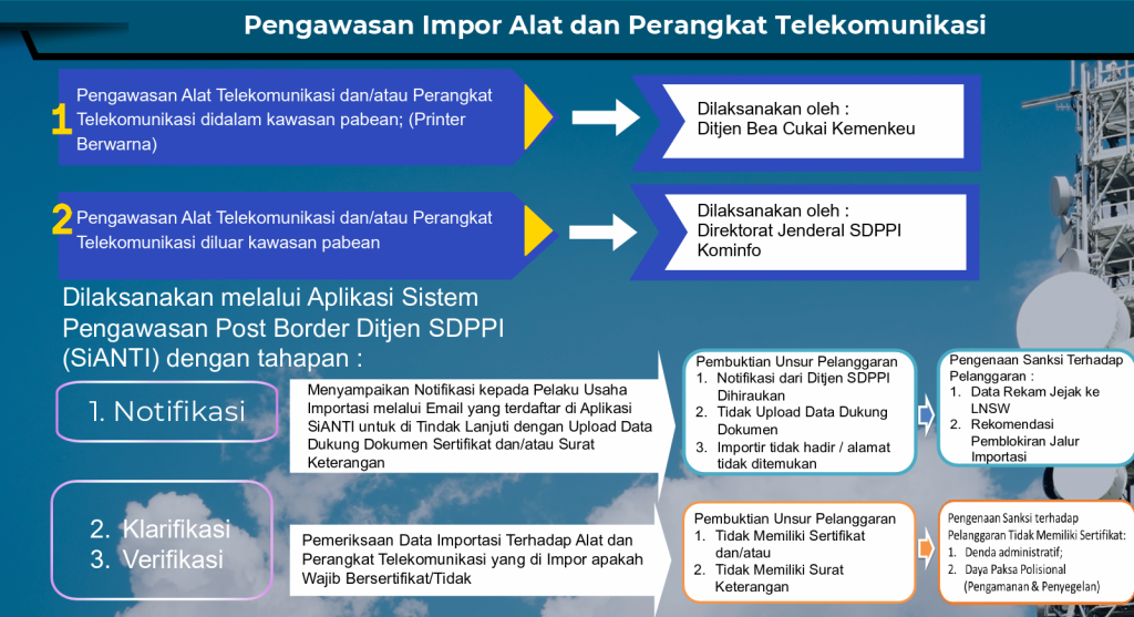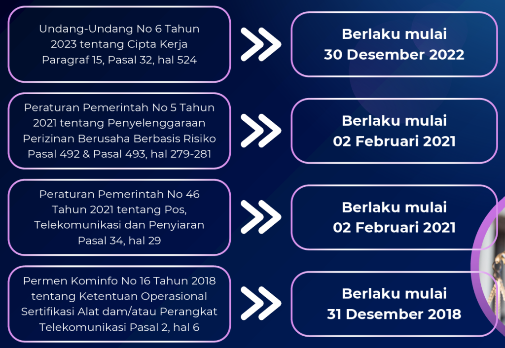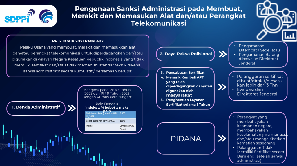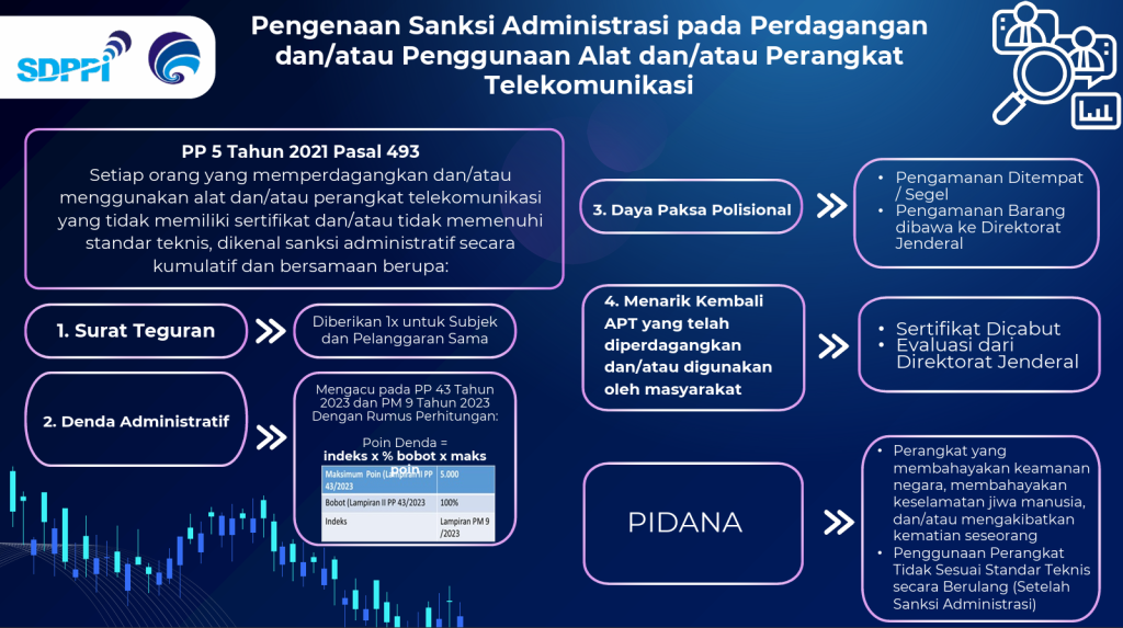 Dengan diberlakukannya Undang-Undang Nomor 6 Tahun 2023 tentang Penetapan Peraturan Pemerintah Pengganti Undang-Undang Nomor 2 Tahun 2022 Tentang Cipta Kerja Menjadi Undang-Undang Maka Sanksi Administrasi terhadap Pelanggaran Alat Telekomunikasi dan Perangkat Telekomunikasi yang dibuat, dirakit dan/atau dimasukan untuk digunakan dan diperdagangkan di Wilayah Negara Republik Indonesia dapat dikenakan secara menyeluruh sesuai ketentuan dan peraturan yang berlaku